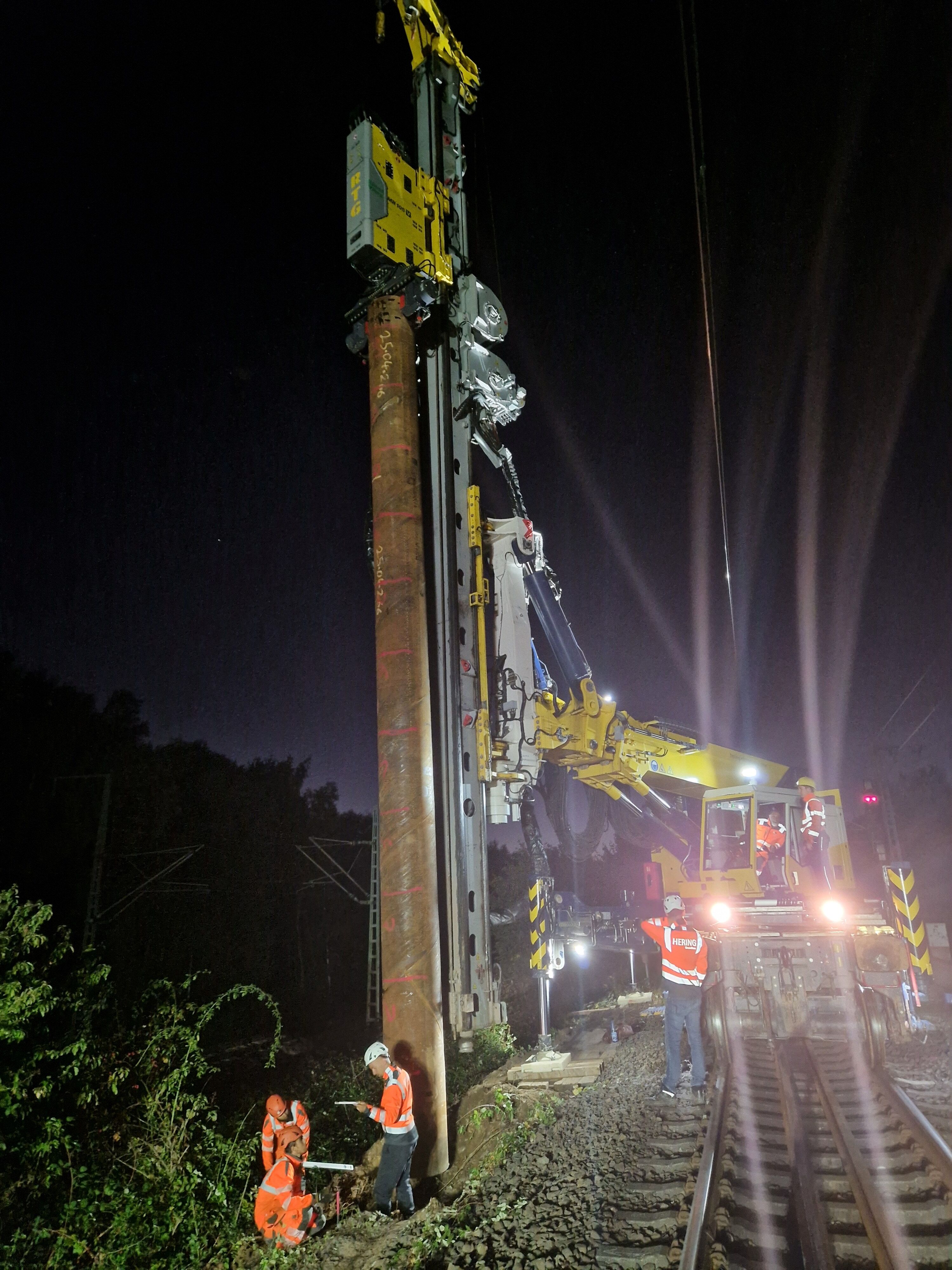 Im Rahmen der Generalsanierung Hamburg‒Berlin werden aktuell hunderte Signale entlang der Strecke ersetzt neu errichtet. Was einfach klingt, ist recht kompliziert, denn Signale müssen sicher stehen, damit sie durch Wind und Windsog aus vorbeifahrenden Zügen nicht umfallen können. Daher müssen Signalmasten zunächst aufwändig gegründet werden – je mehr Gewicht sie später tragen oder je schlechter die Bodenverhältnisse, desto tiefer muss das Fundament reichen. Diese Gründungen erfolgen in der Regel durch Rammrohre. Das bedeutet, Rohre werden mit Zweiwegebaggern bis zu 9 Meter tief in den Boden gerammt und anschließend mit einem Signalfußadapter versehen. Auf diesem Fundament kann dann ein solider Signalmast errichtet werden.