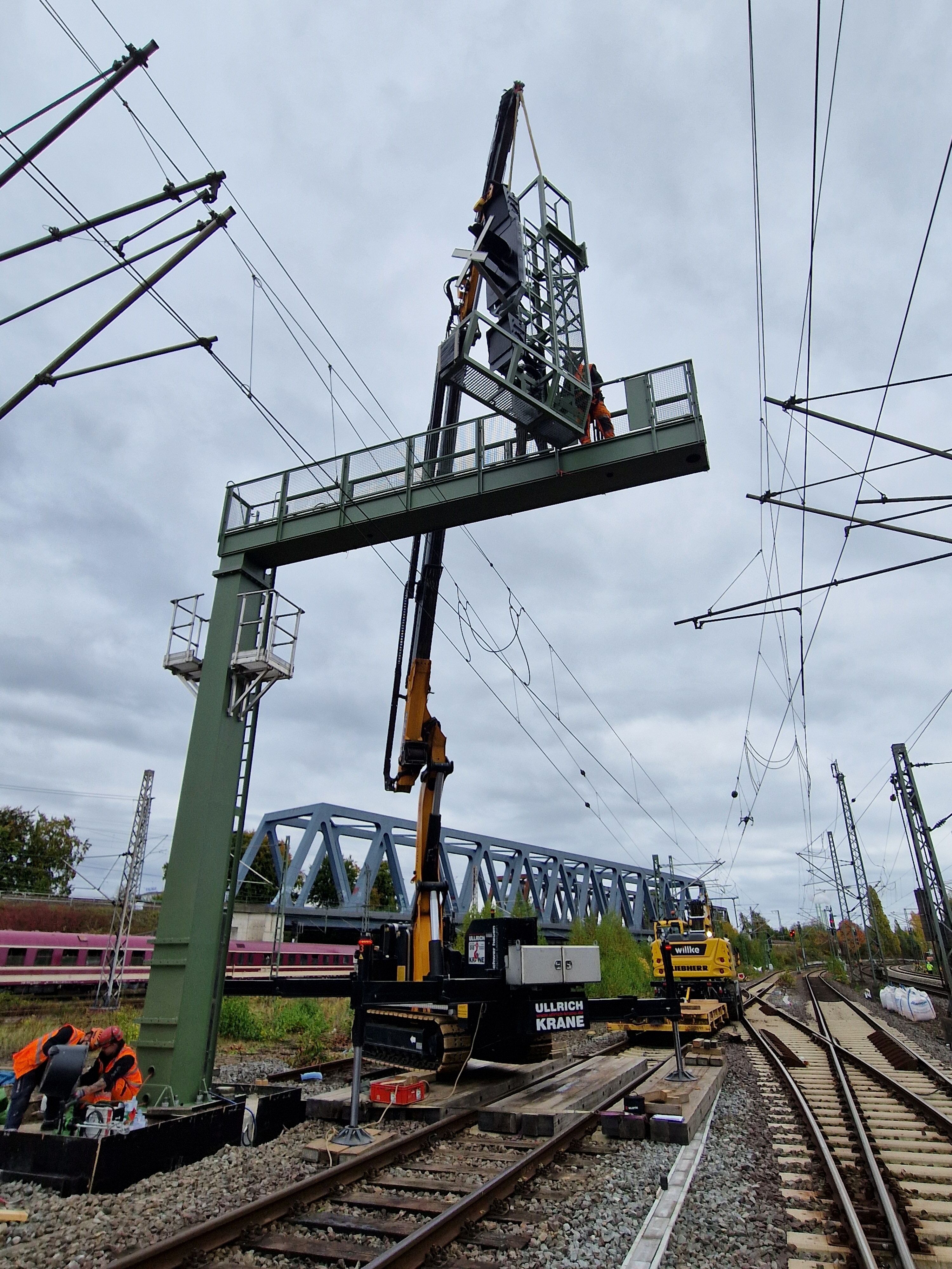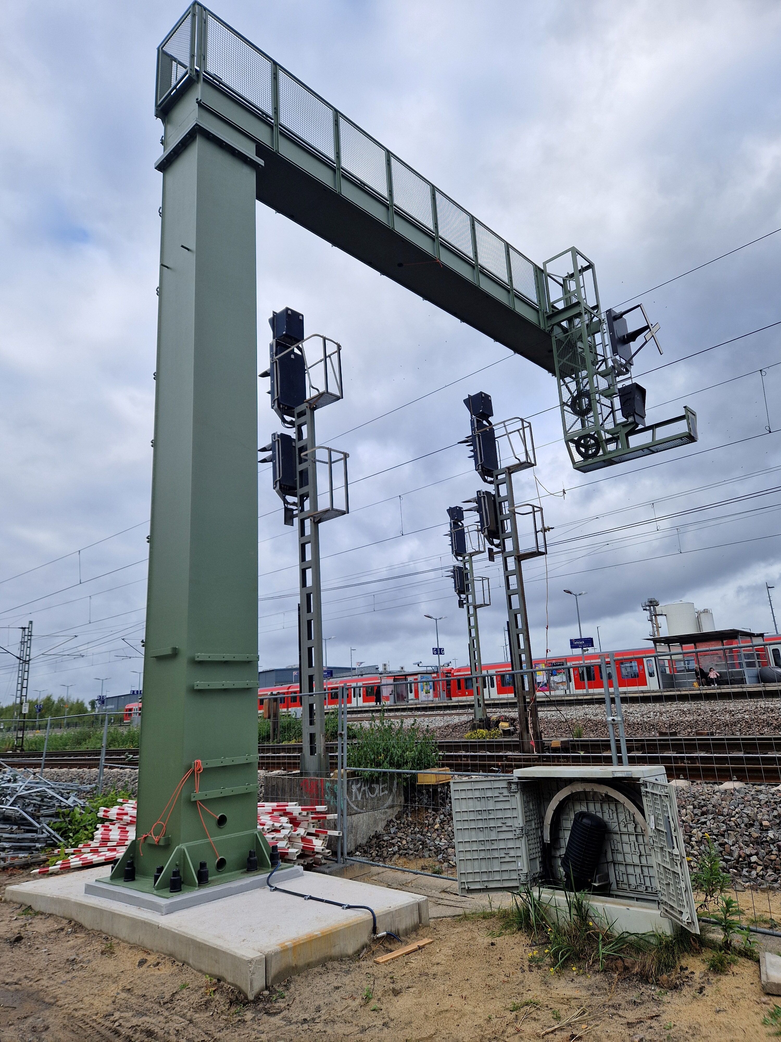 Teilweise sind auch Signalausleger oder Signalbrücken notwendig – vor allem, wenn zwischen den Gleisen nicht ausreichend Platz zur Verfügung steht. Diese Signalausleger sind aufgrund der erforderlichen Auskragung wesentlich massiver und müssen mehr Gewicht tragen – entsprechend ist auch die Gründung aufwendiger. Allein zwischen Hamburg und Büchen werden aktuell 8 neue Signalausleger- und Signalbrücken gegründet. Sobald alle Gründungarbeiten erledigt sind und die Mastelemente, inkl. Signalen und Arbeitskörben, mit der erforderlichen Hubtechnik eingehoben wurden, kann die weitere technische Ausstattung beginnen: Kabel werden verlegt und angeschlossen, sodass die neuen Signale den Lokführern dann ab Mai 2026 wieder den Weg weisen.