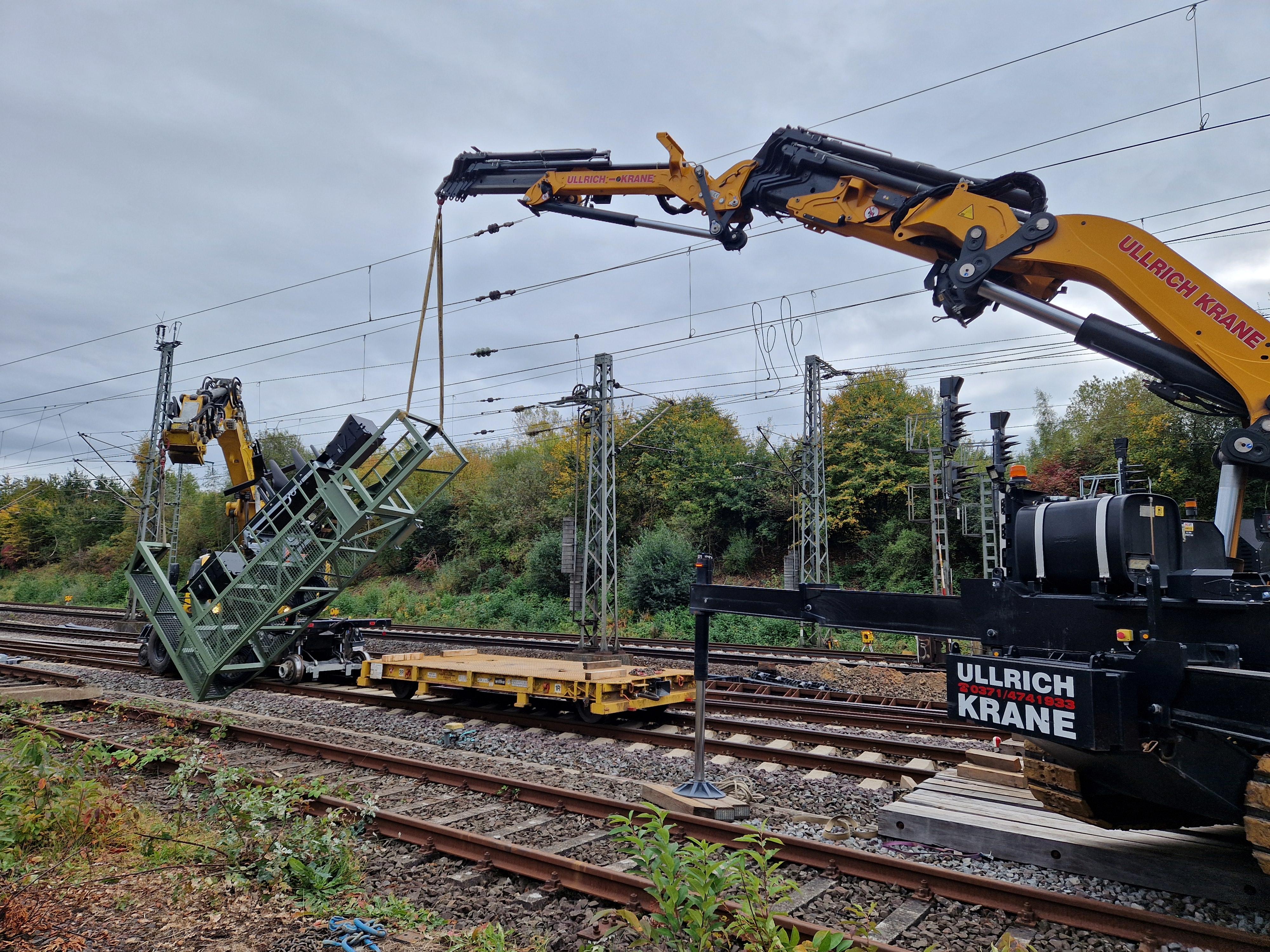 Teamarbeit auf der Baustelle: Der Signalausleger wird mit schwerem Gerät vorbereitet und montiert. -