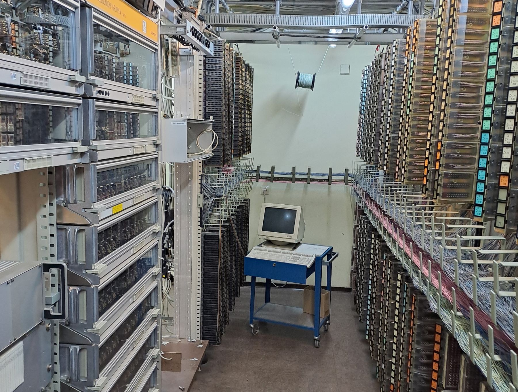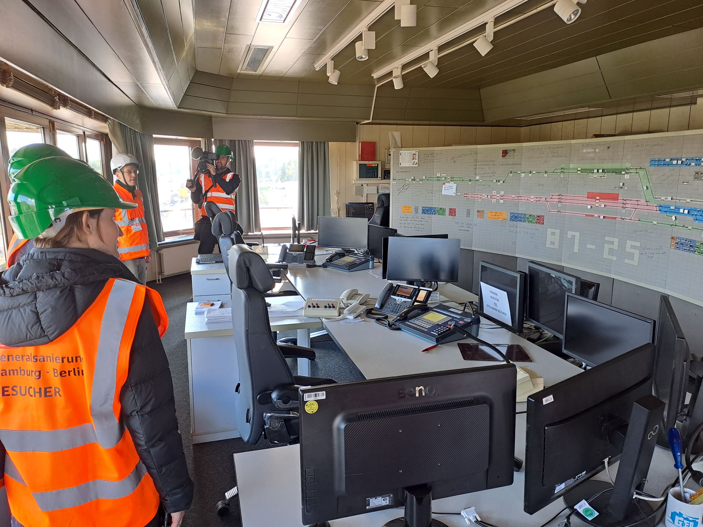Projektleiter Julian Fassing zeigt Medienvertretern das alte Relaisstellwerk.